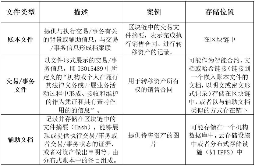 不同区块链系统中,系统开发者会根据数据本身的特点、区块链特性、业务场景的需要将不同类型的数据存储在不同的地方,放在区块链上的数据一般都是经过精心选择的。对于文件档案管理部门而言,需要从业务活动记录的角度出发去识别哪些数据才能构成一份文件,因而需要纳入管理的范畴。Lemieux教授从功能角度,将区块链系统中的文件划分为账本文件(Ledger records)、交易/事务文件(Transaction records)和辅助文档(Supporting documentation)三种类型。三类文件的定义如表1所示。[19]