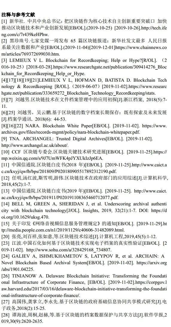 区块链能够以难以篡改、全程回溯的方式保存数据,这和文件档案管理在真实性维护方面具有天然的契合之处。国内外学者均在区块链技术对文件档案管理的影响、优劣势和可能应用等方面开展了探索性研究。其中,UBC大学Lemieux教授的研究团队成果最为丰富,广泛涉及档案学基础理论、信息组织、隐私保护等方面,其主要研究成果集成在发表于2016年10月[3]和2019年6月[4]的两篇研究报告中。笔者先后就区块链技术应用的冲击[5]、数字档案长期保存中的区块链技术应用[6]展开讨论。国内外文件档案主管部门纷纷注意到了区块链对本领域的可能影响,或鼓励研究先行,或组织预研。国家档案局2017年和2018年科技项目立项选题指南中均设有区块链技术相关选题。[7]美国国家档案与文件署(NARA)于2019年2月发布《区块链白皮书》,阐述了NARA在未来接收区块链文件时可能面临的挑战。[8]英国国家档案馆(TNA)和萨里大学、英国开放数据研究所于2017年6月联合开展为期两年的区块链研究项目ARCHANGEL,取得较好成果。[9]