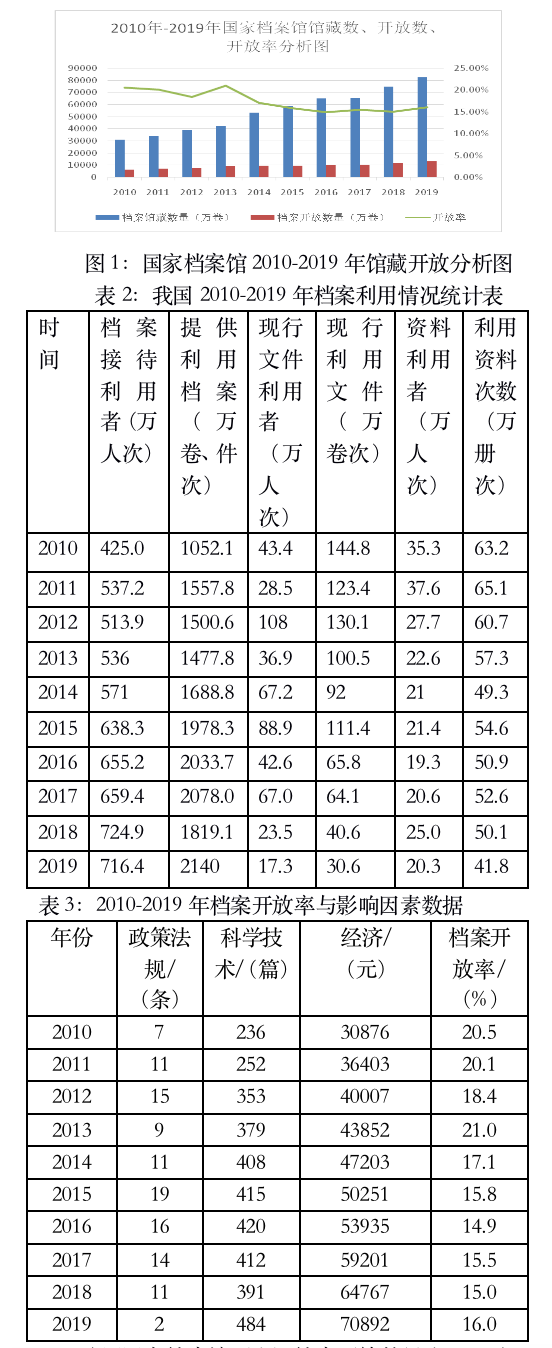 我国2010-2019年档案开放数量呈现上升趋势,档案开放率总体呈现下降的趋势。尽管档案利用呈现缓慢增长的趋势,但对现行文件和对资料的利用人数和次数,仍呈现逐年下降趋势。总体来说,我国2010-2019年档案开放与利用的情况并没有随着社会整体发展而呈现良好的上升趋势,这必然是多种因素作用下的结果,因此,本研究主要目的是探究影响档案开放与利用因素,并针对问题提出建设性意见。