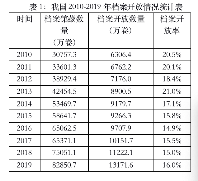 通过中华人民共和国国家档案局网站发布的《全国档案事业基本情况统计年报》和《档案统计资料》中与档案开放有关的数据进行提取,分别得到我国2010-2019年档案开放情况统计表和国家档案馆2010-2019年馆藏开放分析图,如表1和图1所示。