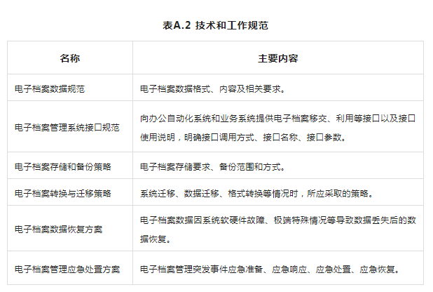 6.3 技术和工作规范名称及主要内容宜参照附录A的表A.2制定。技术和工作规范应与6.2协调配合,明确电子档案数据规范、电子档案管理系统接口规范、电子档案存储和备份策略、电子档案转换与迁移策略、电子档案数据恢复方案、电子档案管理应急处置方案。