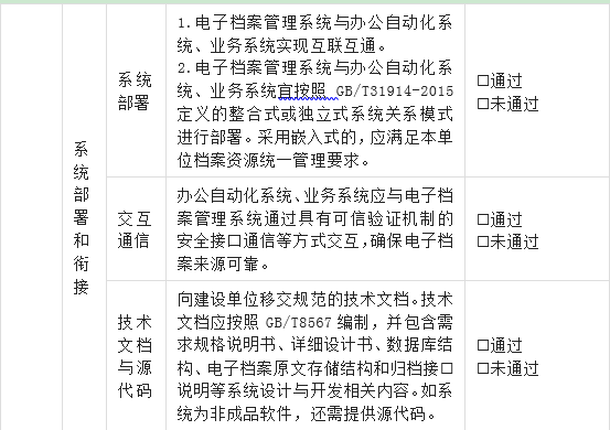 7.3.1 电子档案管理系统与办公自动化系统、业务系统宜按照GB/T 31914—2015定义的整合式或独立式系统关系模式进行部署,实现互联互通。采用嵌入式系统关系模式的,应当满足本单位档案资源统一管理要求。