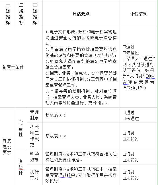 10.3 评估指标所有三级指标评估结果为“通过”视为通过可行性评估,可开展电子档案单套管理。