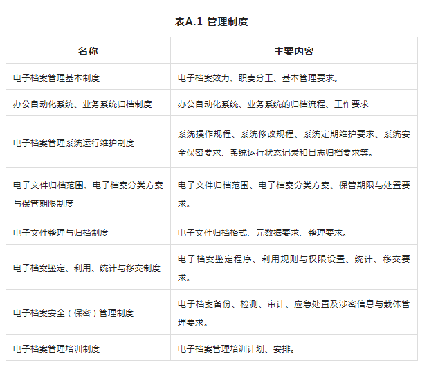 6.2 管理制度名称及主要内容宜参照附录A的表A.1制定。管理制度应规定或明确电子档案效力和各部门职责分工,办公自动化系统、业务系统、电子档案管理系统管理流程和运行维护要求,电子文件归档范围,电子档案分类方案与保管期限表,电子文件整理、归档要求,电子档案鉴定、利用、统计与移交要求,电子档案安全(保密)管理要求,电子档案管理培训要求等。管理制度可以根据需要单独或合并制定。