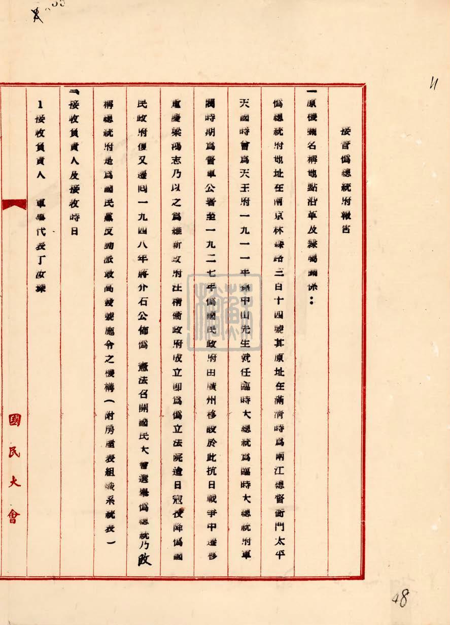 内容与评价:1949年4月23日,南京解放,南京城实行军事管制。军管会政务接管委员会派出军代表接管国民党政府的各级机构,并在接管后完成详细的接管报告。这份写于1949年11月的《接管伪总统府工作报告》,主要有六方面的内容:一原机构名称地点沿革及隶属关系,二接收负责人和接收时间,三接收经过,四处理经过,五现时情况,六主要经验教训,并附伪总统府组织系统表等详细内容。