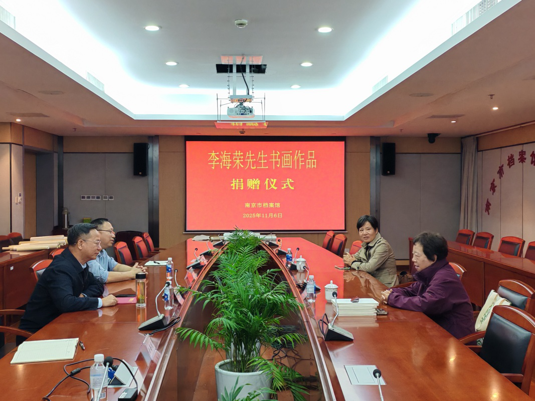 11月6日,南京市档案馆举行中国书法家协会会员,南京市文联原副主席及党组副书记李海荣先生书画作品捐赠仪式。李海荣先生的夫人徐学群女士向南京市档案馆捐赠62件书画作品。南京市档案馆副馆长王长喜接受捐赠并向徐学群女士颁发捐赠证书。