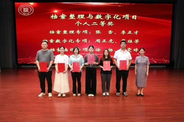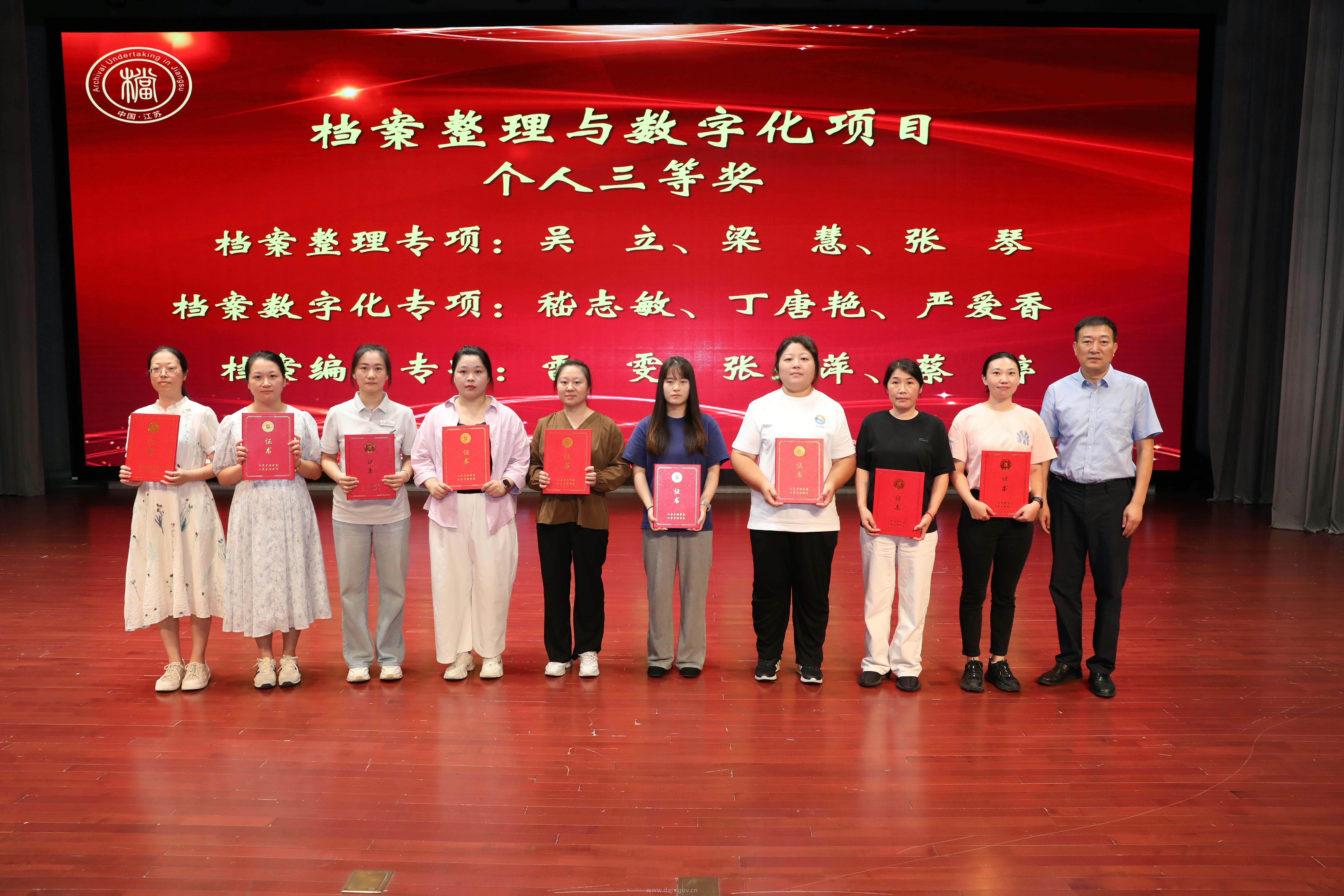 省档案馆二级巡视员钱耀明为获得档案整理与数字化项目团体二等奖的代表队颁奖