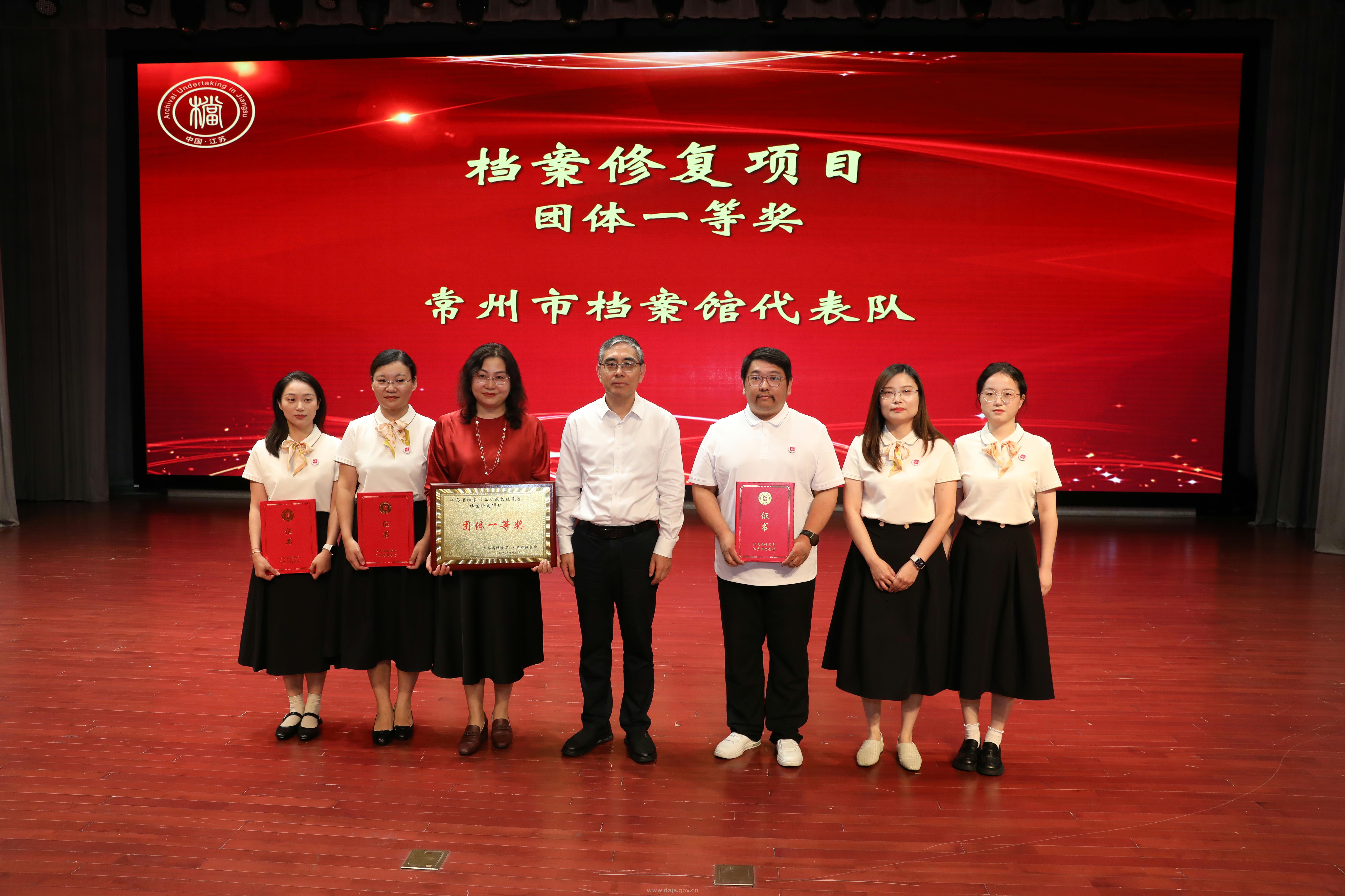 省档案局局长、省档案馆馆长顾俊为获得档案修复项目团体一等奖的代表队颁奖