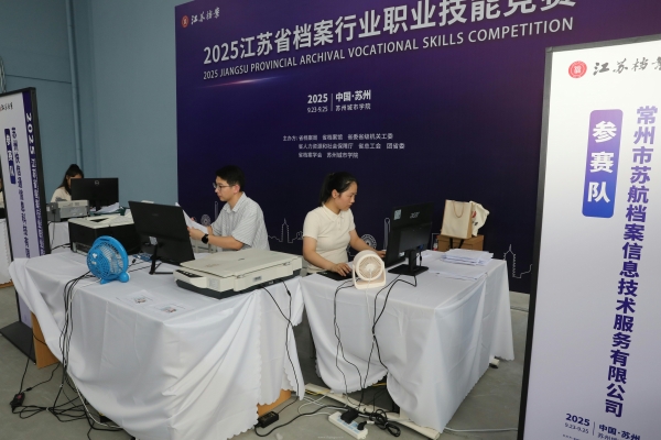 本次竞赛设置档案修复、档案整理和数字化两个竞赛项目,将业务理论检验与技能操作考核有机融合,一体化展示传统修复技艺与新质生产力赋能档案数字化成果,为参赛选手们提供了切磋技艺、展示专业水平的舞台。竞赛期间,省档案学会组织了2025年江苏档案创新与应用产品展示活动,在赛场专门设置展示区域,18家档案服务企业会员单位入场展示,集技术交流、产品展示、文化传播与人才对接于一体,高水平的职业技能竞赛与前沿产业成果展示有机结合,助力档案服务企业成长。