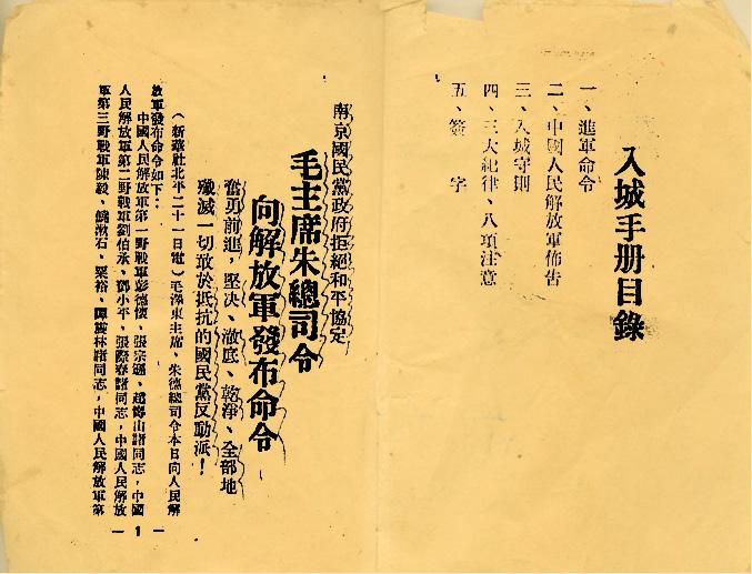 内容与评价:1949年华东军政大学政治部印《入城手册》的主要内容是《毛主席、朱总司令向解放军发布命令》《中国人民解放军布告》《入城守则十条》《三大纪律、八项注意》等,是我党我军关于渡江作战、解放南京后的政策及行动指南。