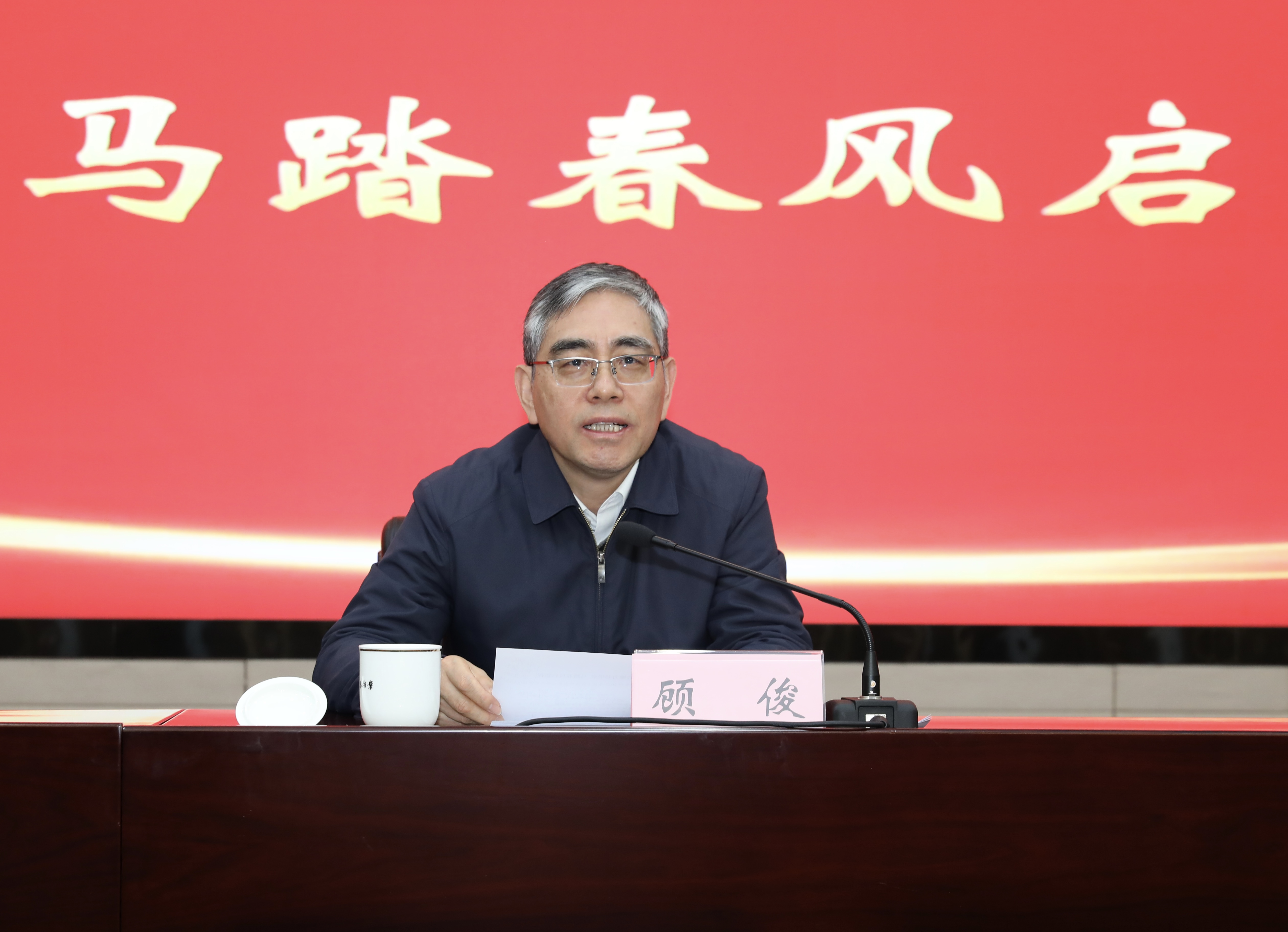 顾俊馆长以《兰台聚力书华章 马踏春风启新程》为题发表讲话。