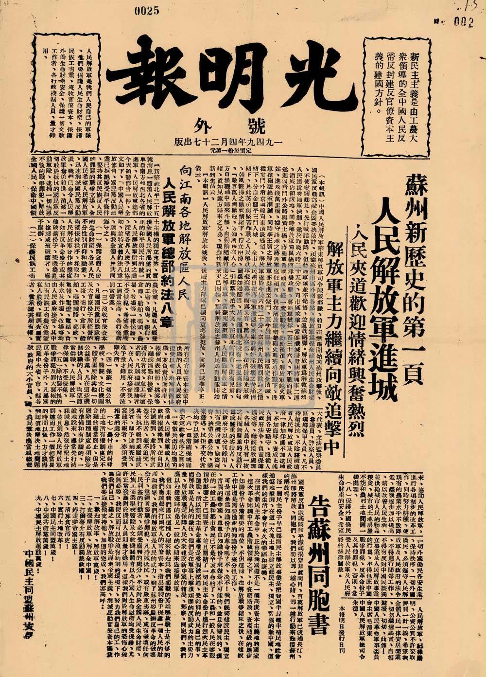 《光明报》(号外)苏州解放
