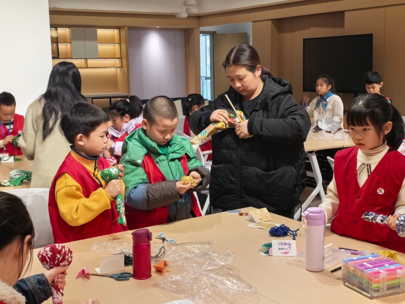 小记者们在讲解员的引导下参观了“历史见证未来——常州档案文化展”。透过一份份泛黄的文献、一张张珍贵的老照片,小记者们不仅了解了常州2500多年的建邑史与城市变迁,更从档案的视角“遇见”了从这片土地上走出的史良、罗伊、陈衡哲等杰出女性——她们或是在革命年代英勇抗争,或是在文教领域熠熠生辉,档案如同“时光机”,让巾帼风采跃然眼前。随后,老师结合档案史料,生动讲述了国际妇女节的由来,并分享了张桂梅、屠呦呦等中国杰出女性的感人故事,在孩子们心中播下尊重与奋进的种子。在手作环节,小记者们在老师的指导下填充艾草、包裹棉布、缠绕锤柄,将满满心意融入一柄柄散发着清香的“艾草锤”。这份饱含感恩之情的礼物,将在妇女节当天送给母亲,以此致敬日常生活中的“她力量”。