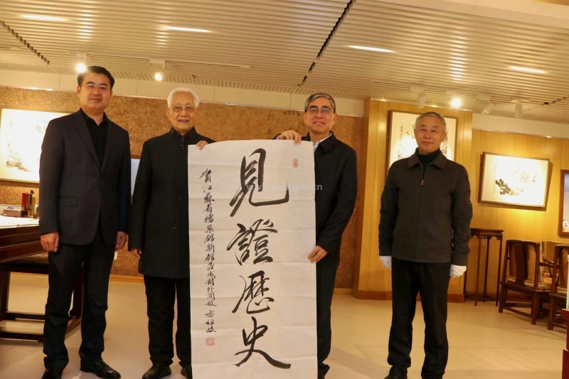 方祖岐现场观看了省档案馆宣传片《牢记嘱托 筑梦兰台》和“华中长城 铁军忠魂——长三角地区新四军档案史料展”,他结合自身革命历史与军旅生涯,回顾了新四军在华中敌后浴血奋战的动人故事和光辉历程。随后,方祖岐走进馆特藏室,仔细察看馆藏珍贵档案、名人档案等特色珍藏,对省档案馆在档案征集、红色档案开发利用、档案仿真复制等方面的工作给予高度肯定。他表示,档案是历史的真实记录,是民族记忆的重要载体,并现场捐赠了手书的“见证历史”书法作品。